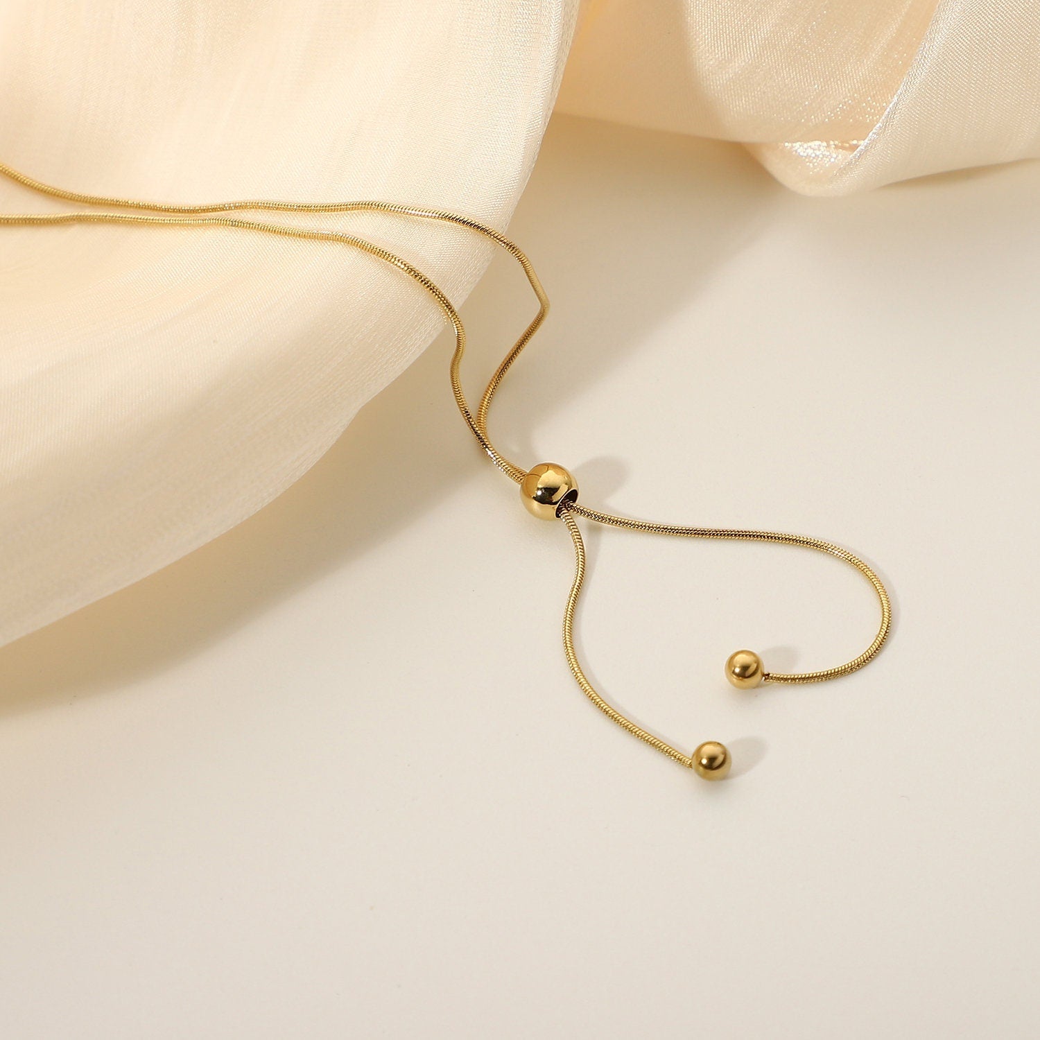 Featuring a sleek, 18k gold-filled chain with elegant ball drops, this necklace is a contemporary classic. Its minimalist design offers versatile sophistication, perfect for elevating both day and night ensembles.