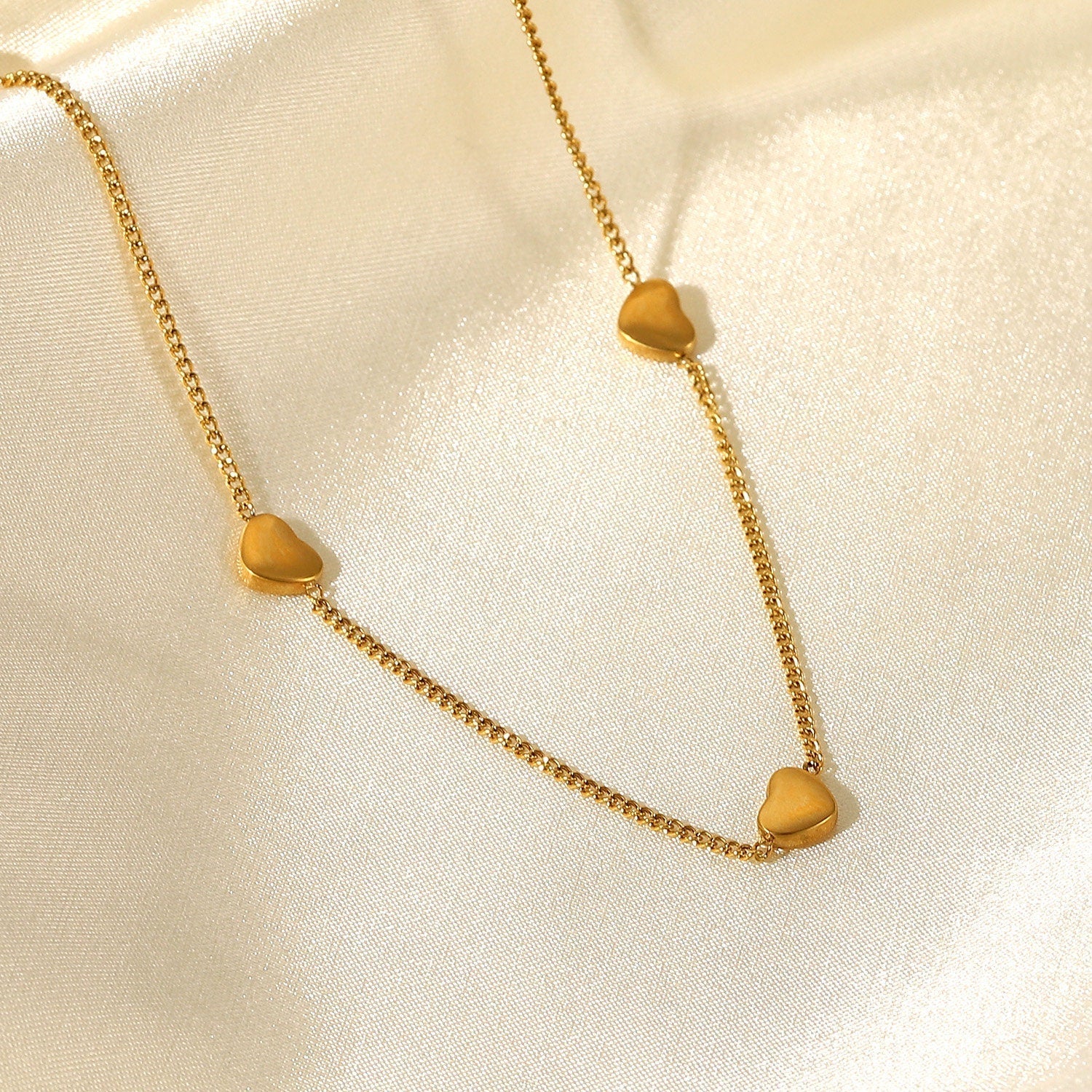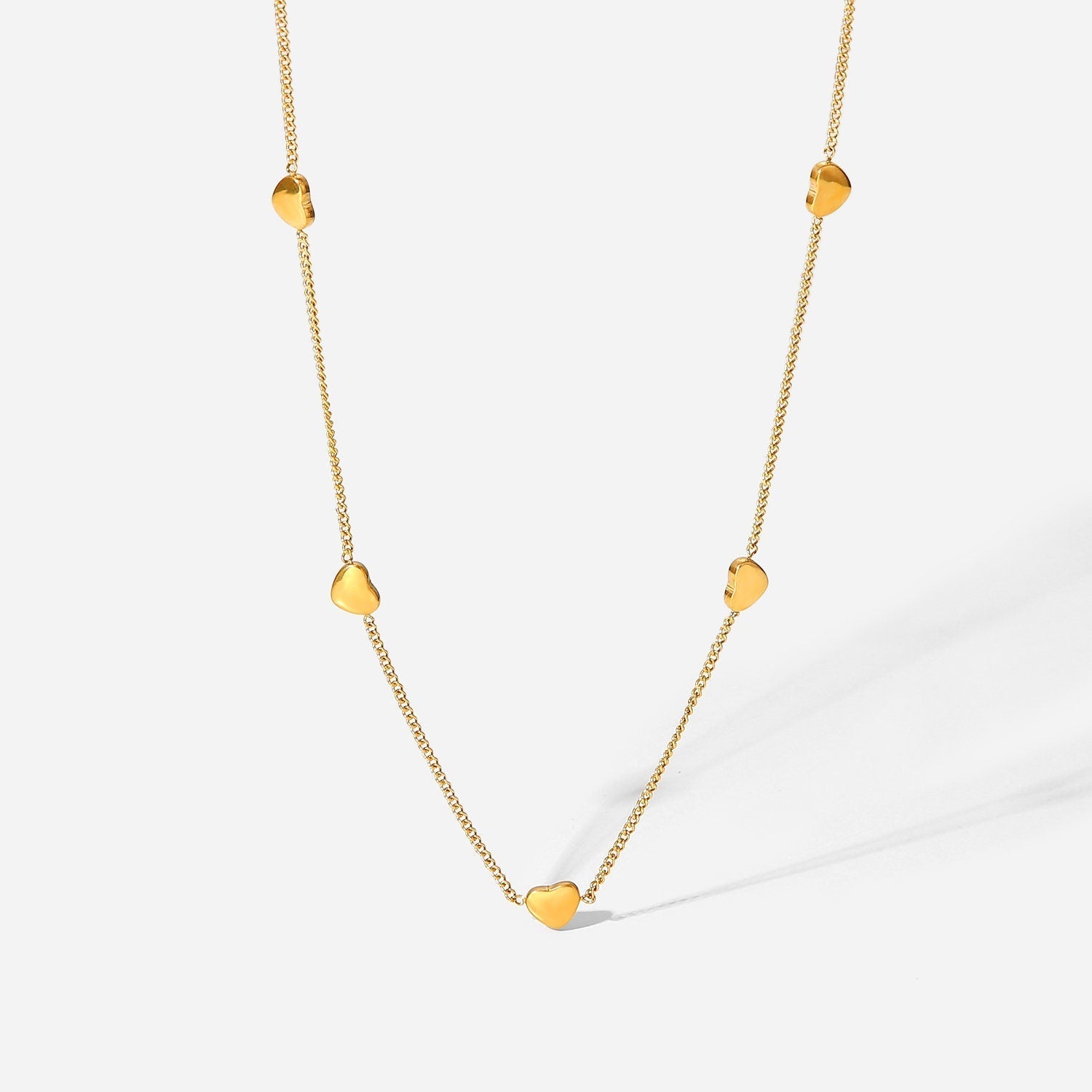 The Heart Charm Necklace, adorned with a charming heart on an 18k gold-filled chain, symbolizes love and tenderness. Its endearing design is perfect for adding a sentimental touch to any ensemble.