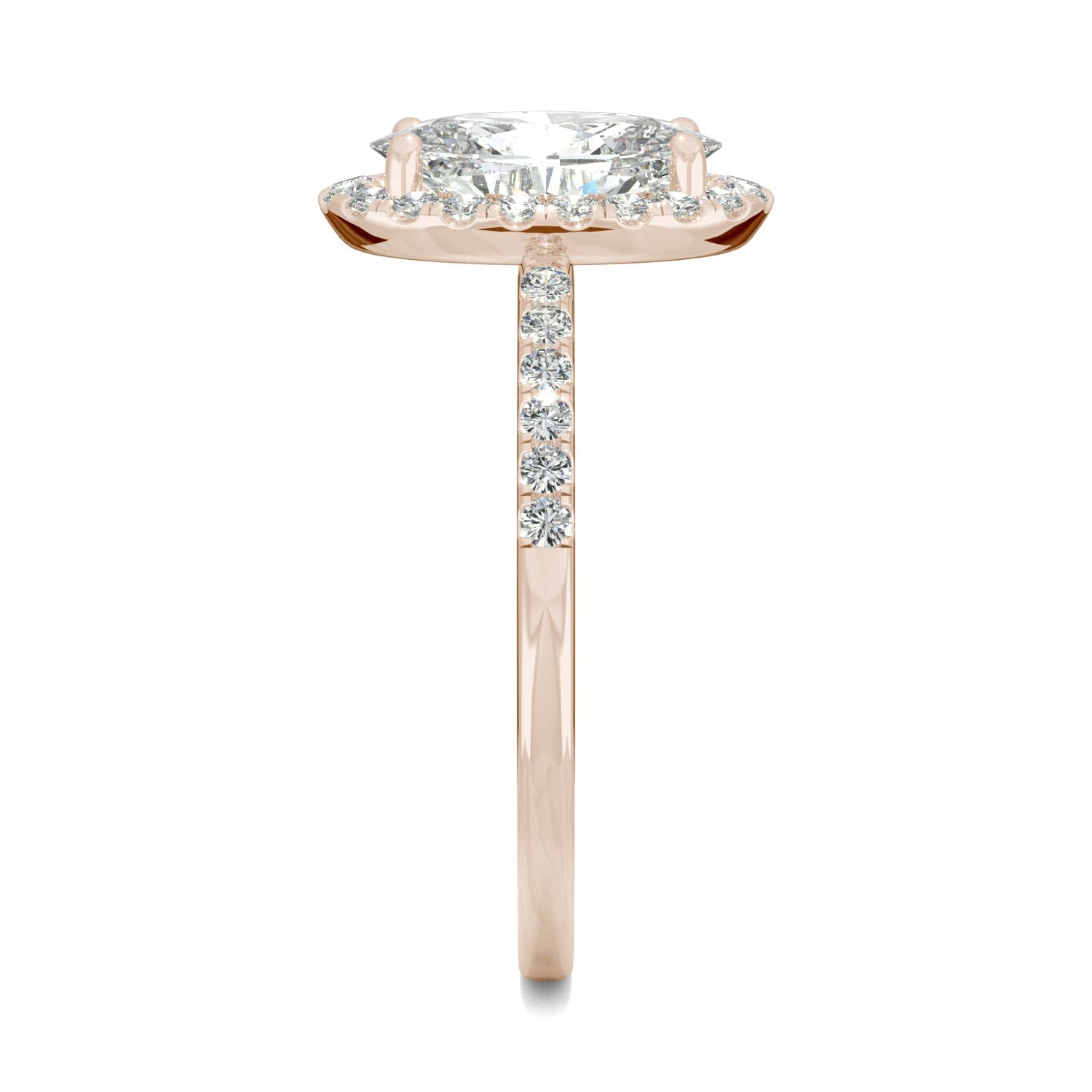 To your brilliant proposal. A gorgeous elongated oval moissanite gem is at the heart of this heavenly halo engagement ring. Crafted in exquisite 14k gold with a sea of shimmery accent gems lining the shoulders.