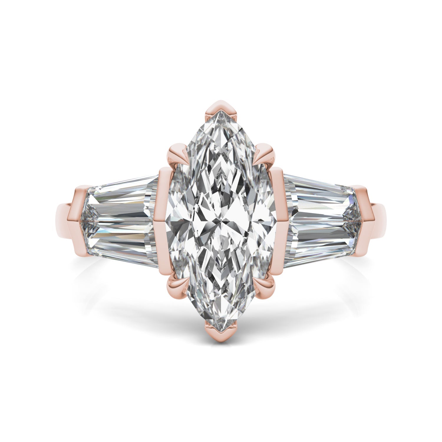 Bold and Geometric, this marquise engagement ring, with double baguette accents, was made for the lady who wants to stand out! The rose gold band accentuates the bling while maintaining a dainty and artistic feel.