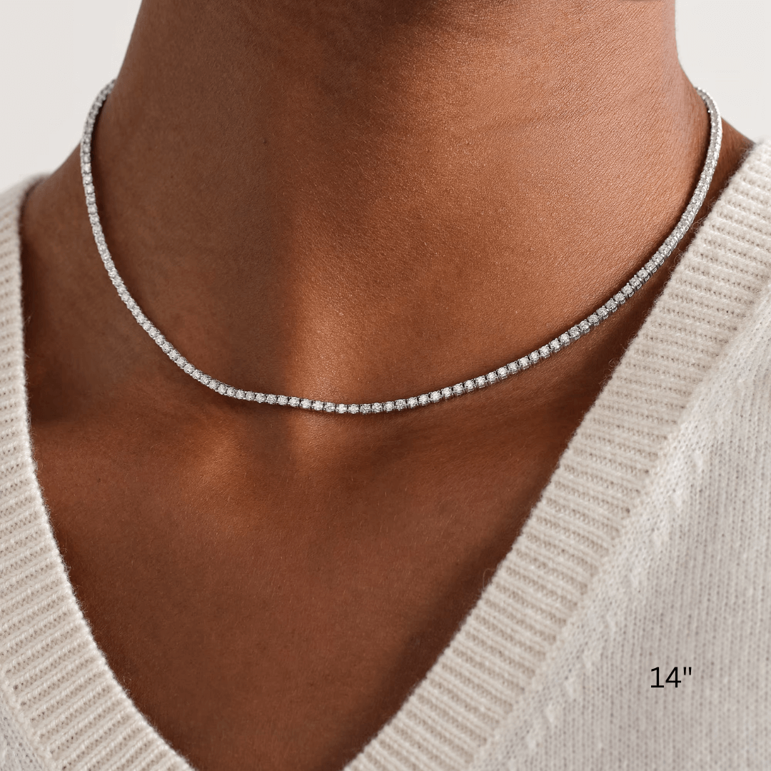 The Moissanite Tennis Necklace features 2mm moissanite stones, offering unmatched brilliance that rivals diamonds. Set in rich 18k white gold vermeil, it’s timeless, versatile, and made to shine—day or night. A piece you'll reach for on repeat, because effortless luxury looks good on you.