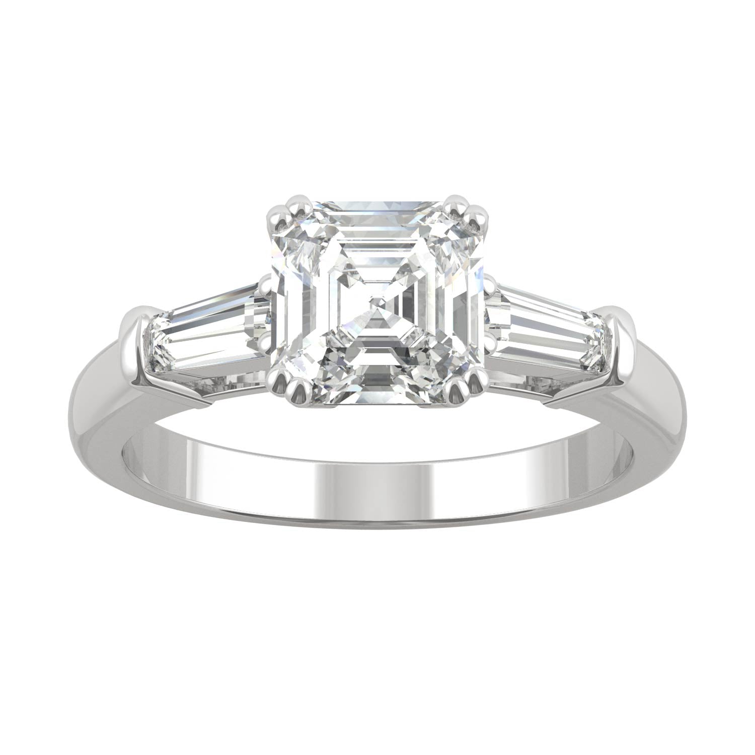 A classic with a twist. Let this gorgeous engagement ring pave the way to ever-after. Exquisite elegance starts with the mesmerizing brilliance of an Asscher cut center stone. Perfectly flanked step baguettes on each side create beautiful symmetry and antique-inspired style.