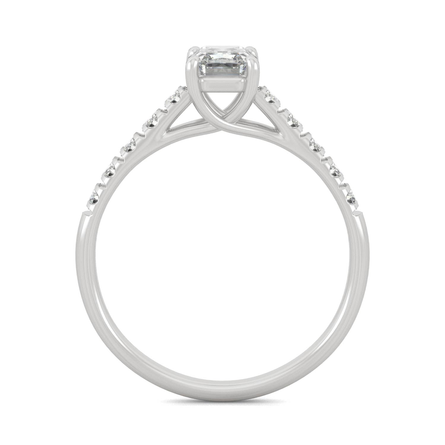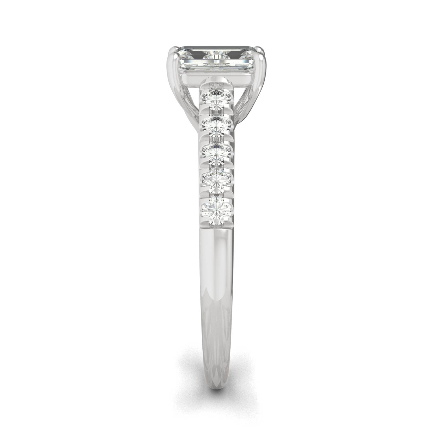 The detail in this 1.24 carats emerald moissanite side-stone ring is sure to take your breath away! In 14K white gold, it features a stunning twist gallery and an elegant gemstone band. It's the perfect balance of vintage whim and modern chic.