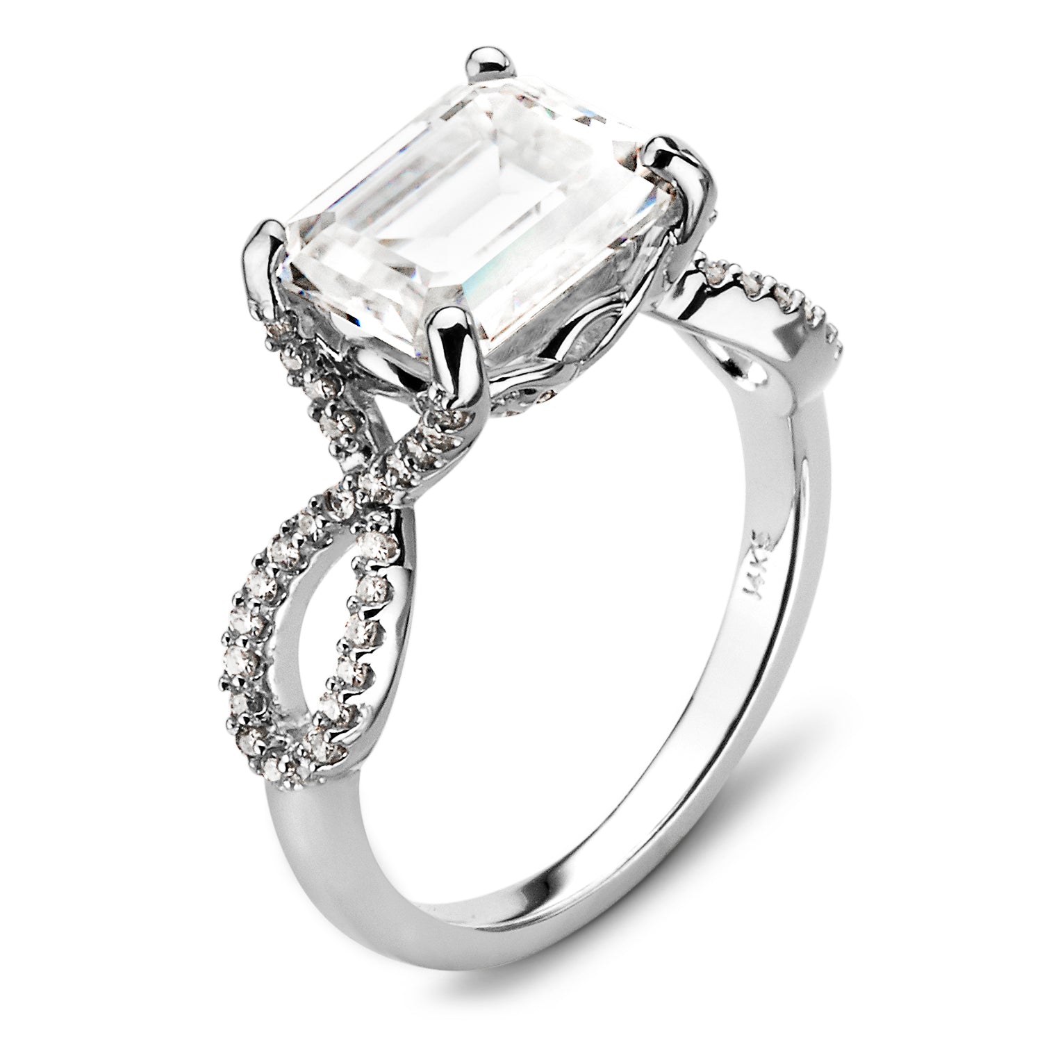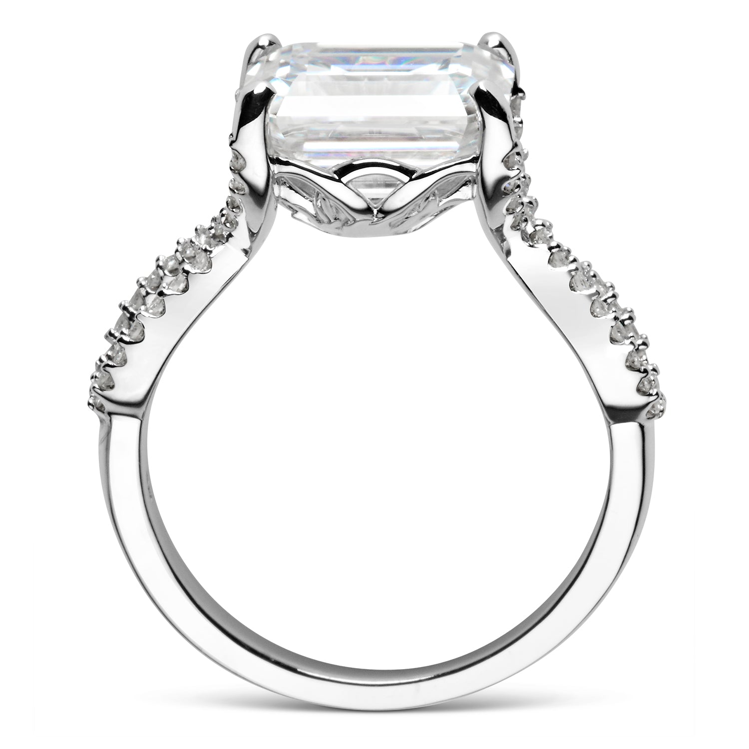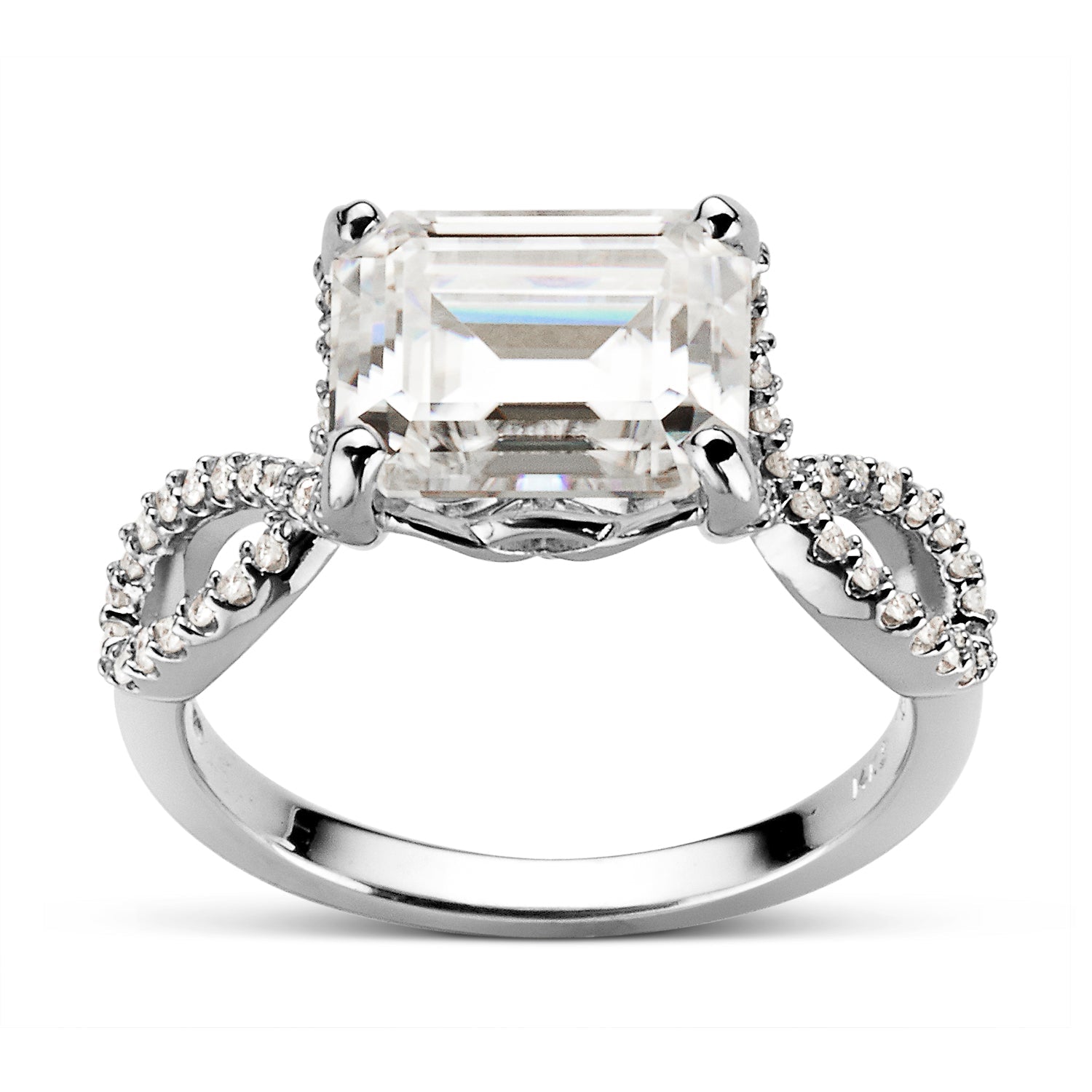3.80 CTW DEW Emerald Moissanite East-West Twist Side-Stone Engagement Ring in 14K White Gold