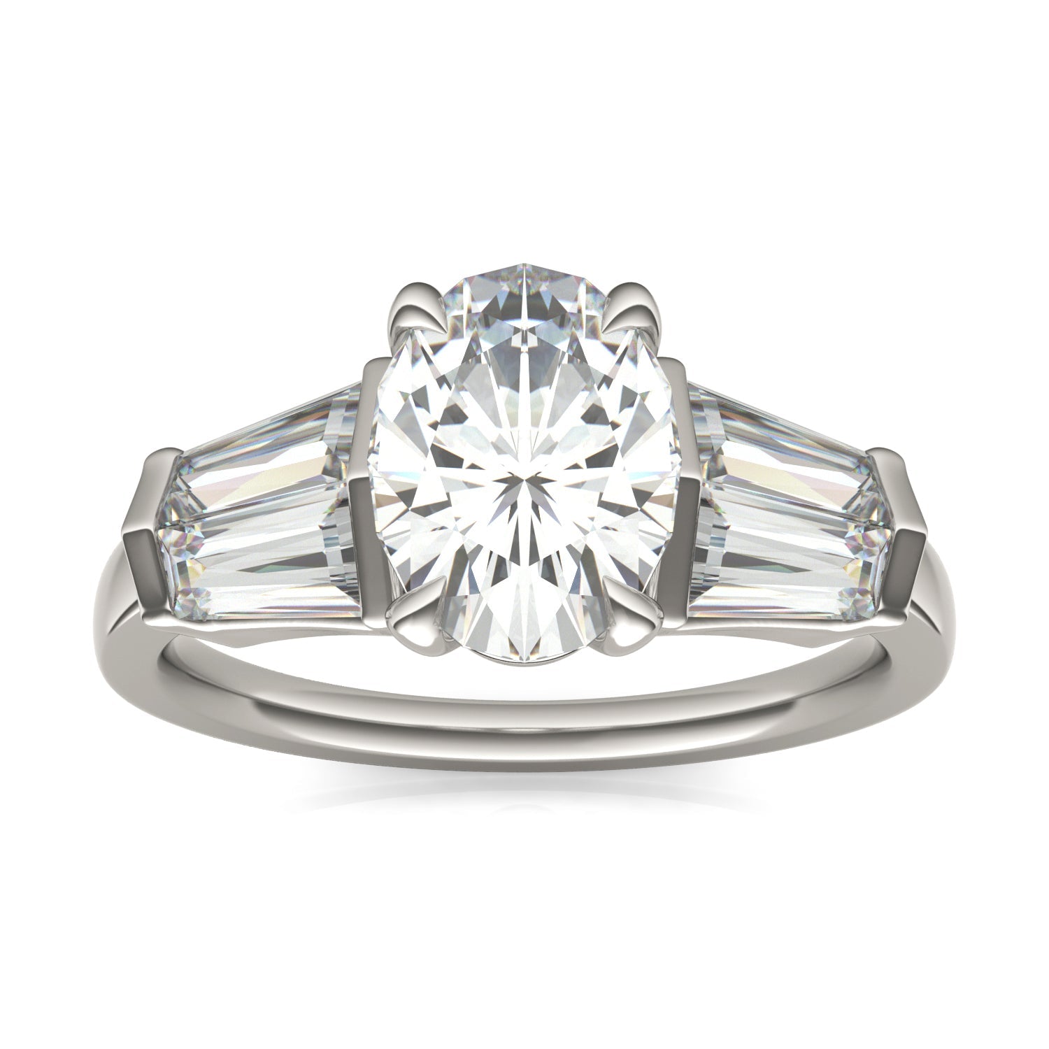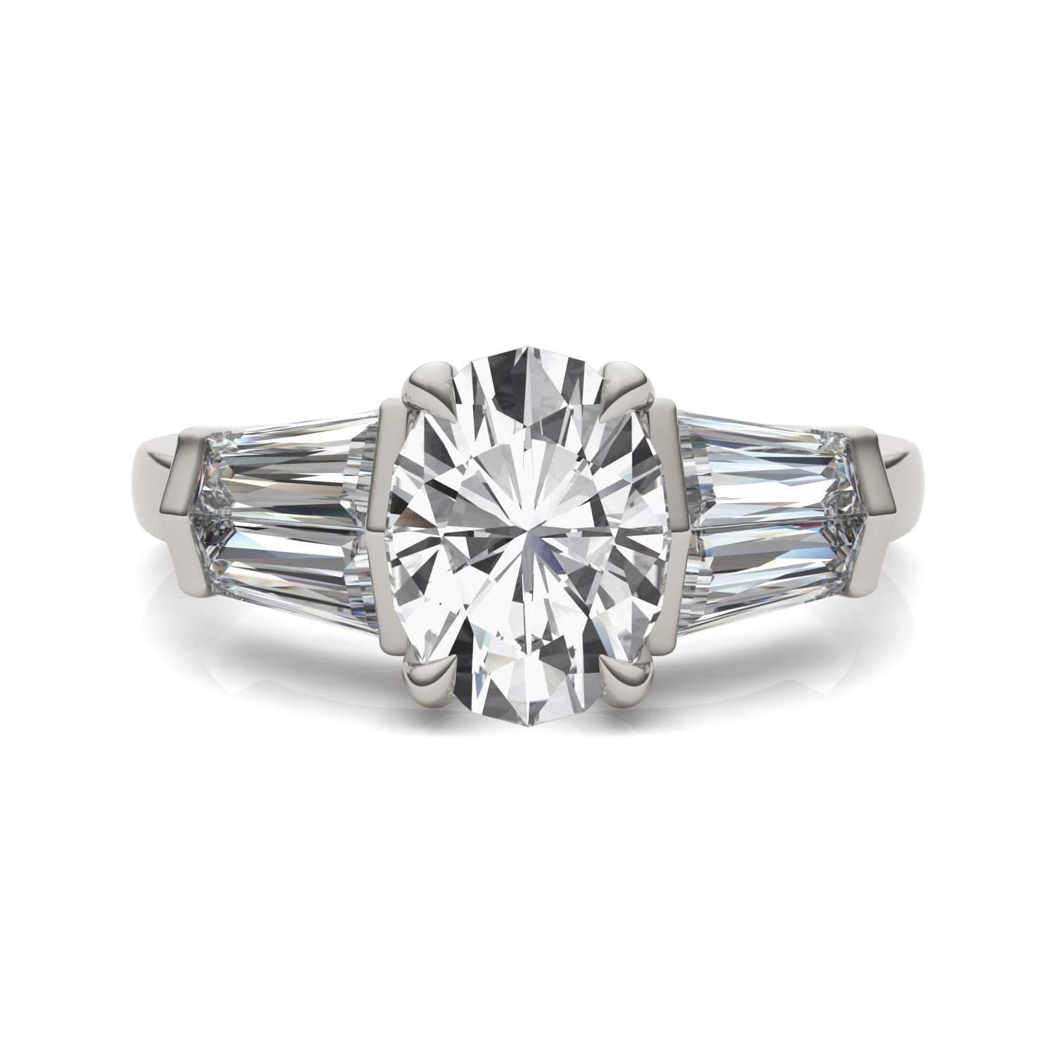Bold and Geometric, this oval engagement ring, with double baguette accents, isn't for the lady who likes to blend in! The white gold band intensifies the bling to create a stunning statement.