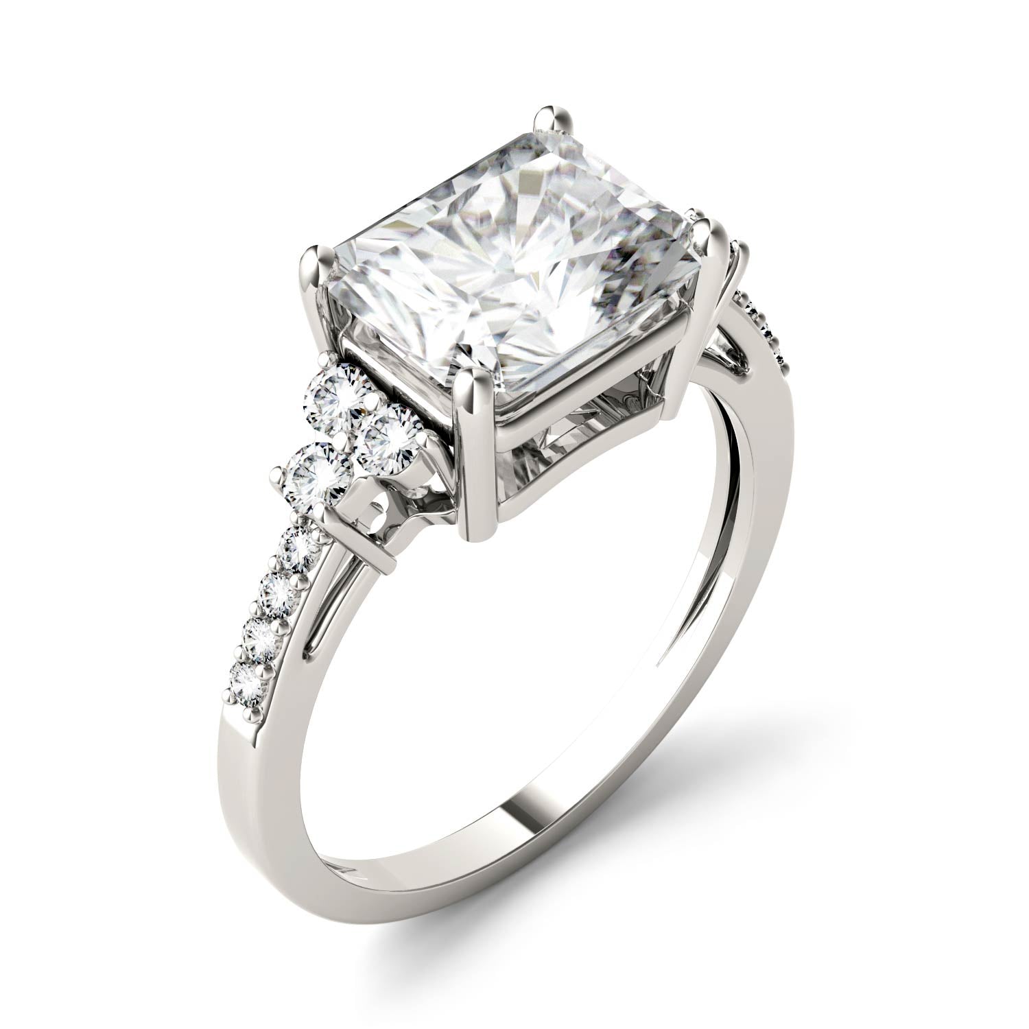 A radiant-cut center gemstone, framed by a trio of round cut stones on either side and smaller cascading stones. This ring is exceptionally crafted with brilliant moissanite.