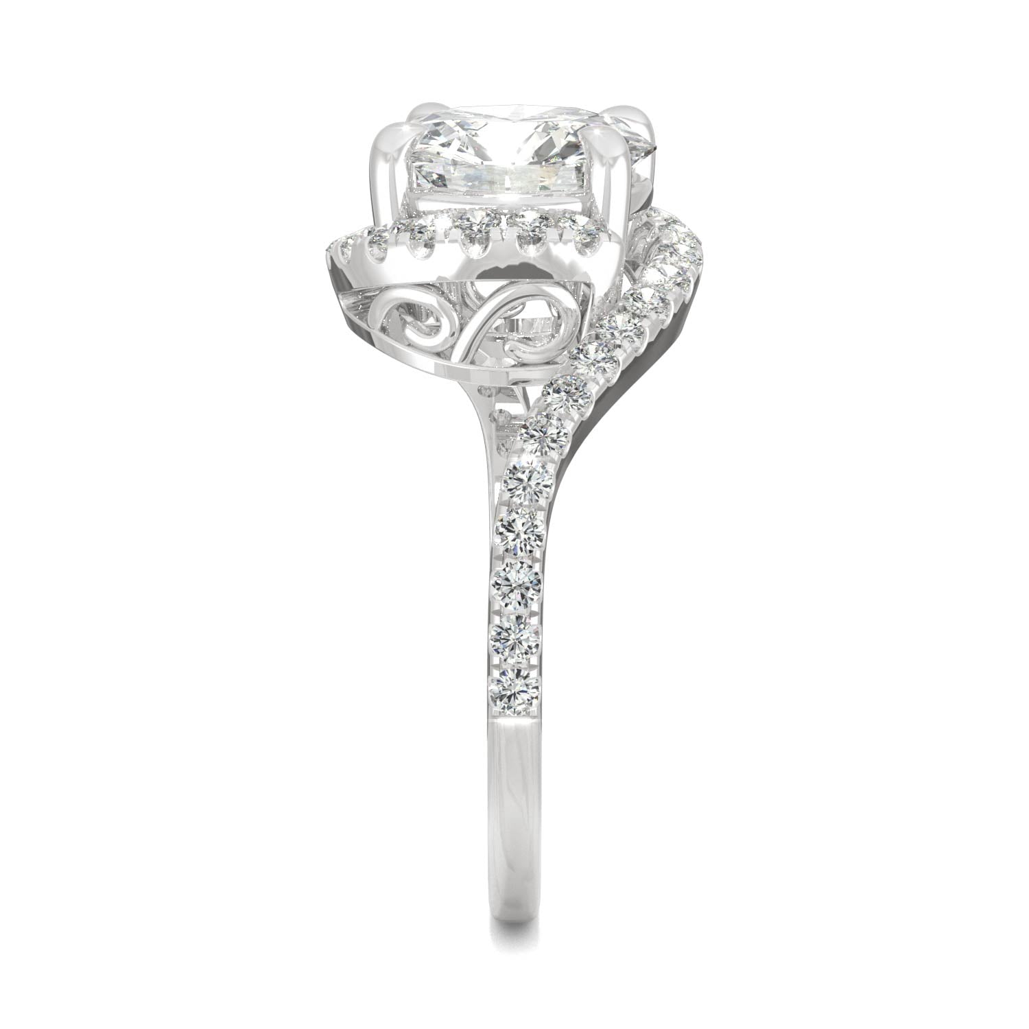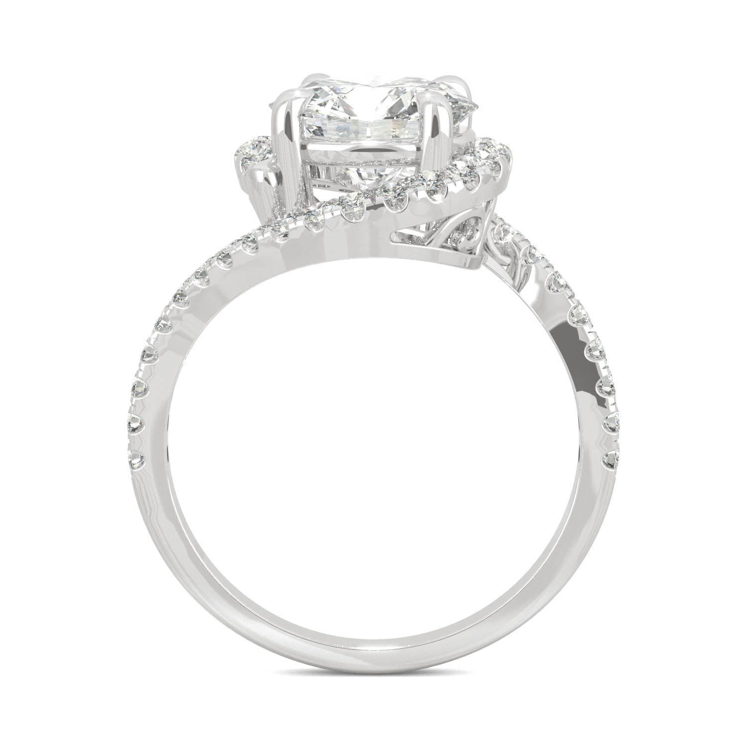 At once classic and unique, this halo engagement ring has a bypass design that highlights an 8mm moissanite at the center. Surrounded in petite accent stones and carrying a total diamond equivalent weight of 2.24ct, this 14k white gold ring will take her breath away.