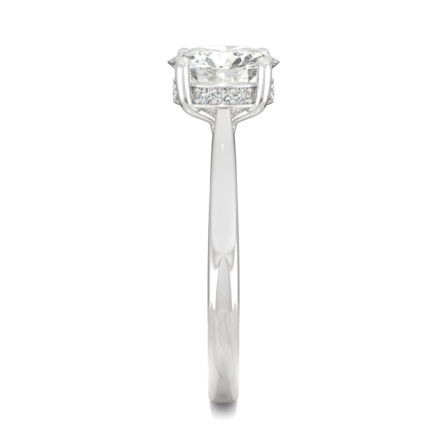 Classic and sophisticated with a hint of modern style. A brilliant round solitaire rests in a basket setting surrounded by a hidden halo of sparkling accent gems. A beautiful engagement ring to mark your journey into forever.