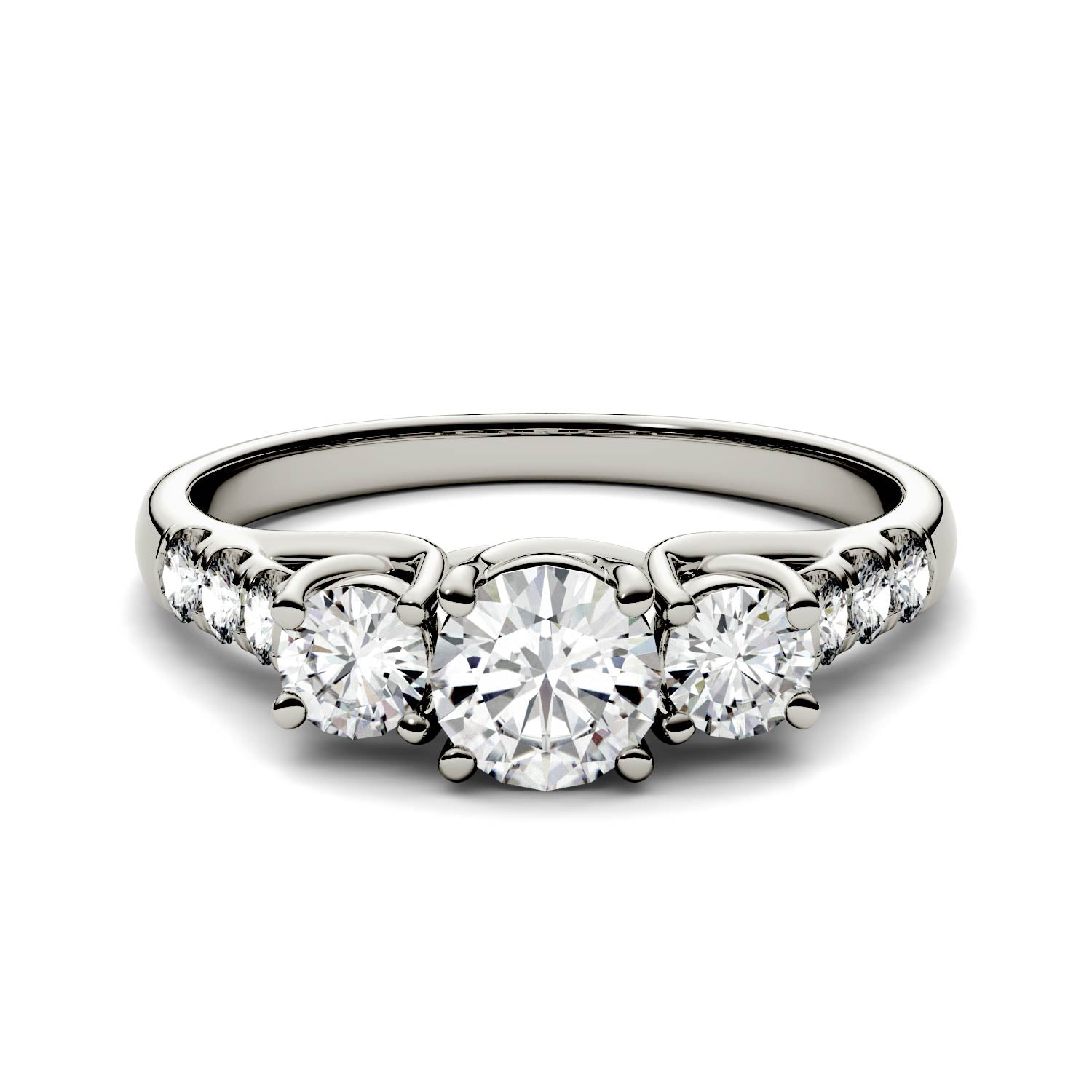 This is a stellar three stone round brilliant ring, yet let's not forget the side details. All three center stones have trellis detialing, leading to the pronged side stones, three on each side.