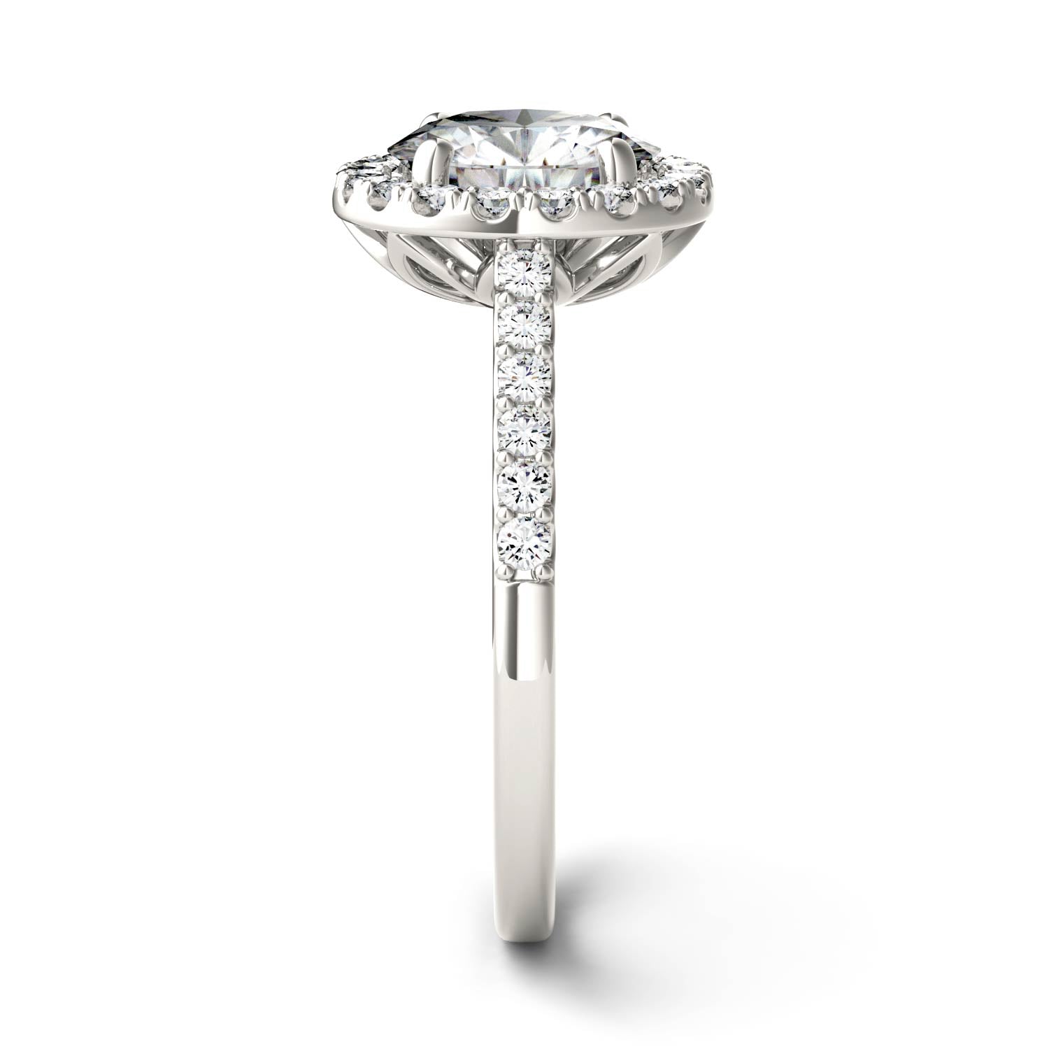 Treat her like an angel with this stunning moissanite round halo ring. The center stone is an 8.0mm round moissanite surrounded by a halo of 1.5mm moissanite gemstones which also accent the shoulders of the band. The band is crafted from 14k white gold with a polished finish.