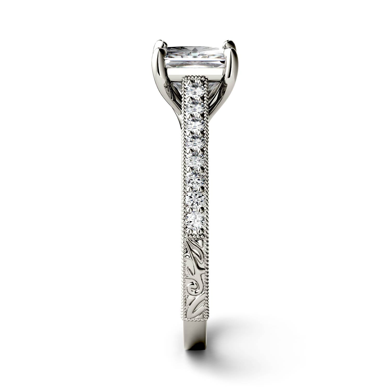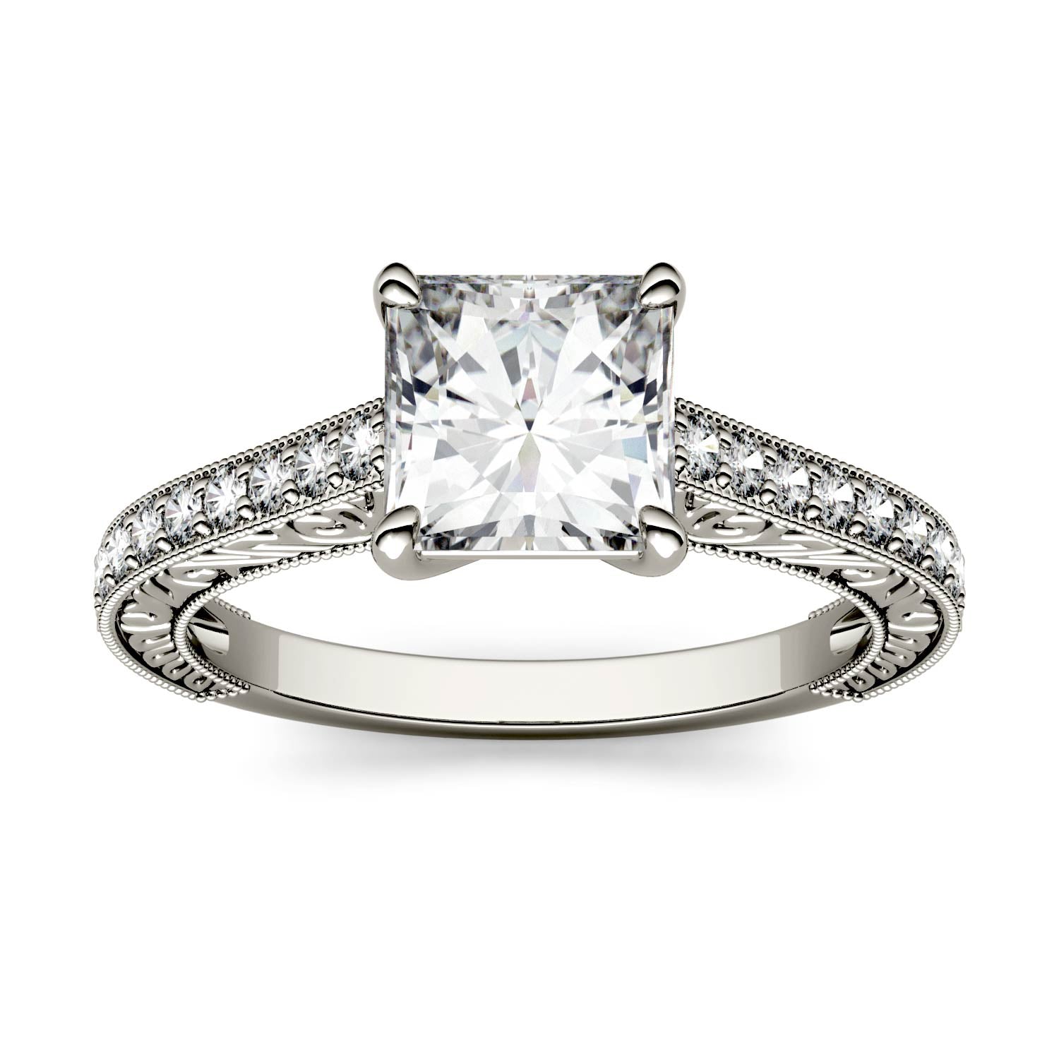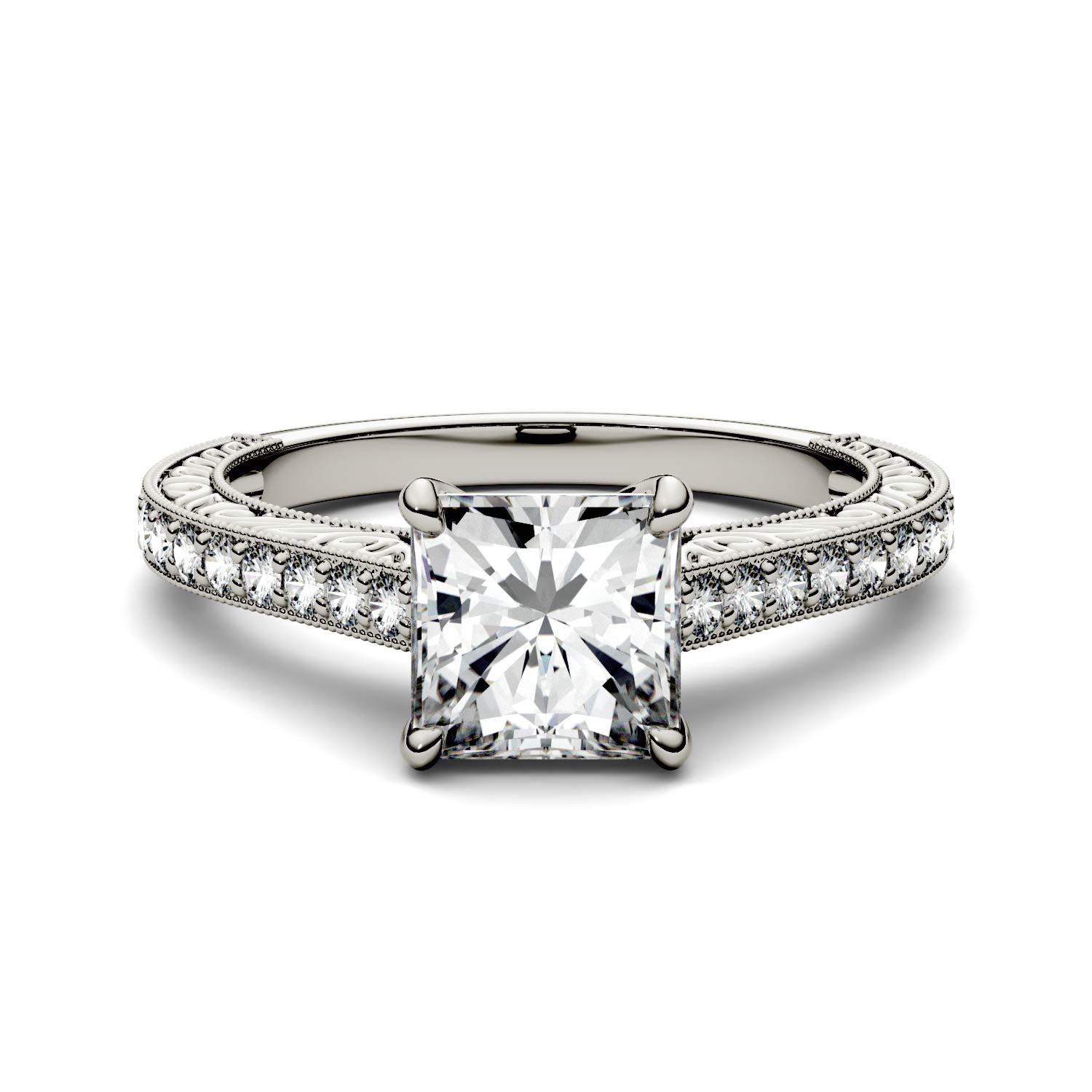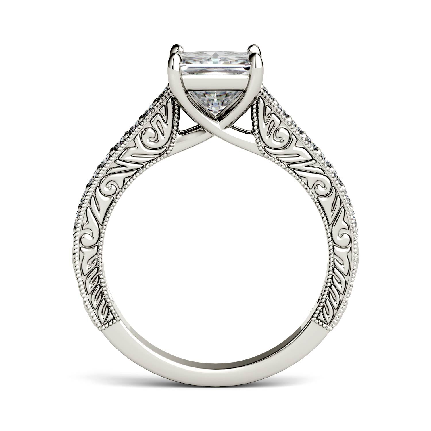 The detail in this 1.94 carats square moissanite side-stone ring is sure to take your breath away! With stunning details along the 14K white gold band and gallery, it's an incredible balance of vintage whim and modern chic.