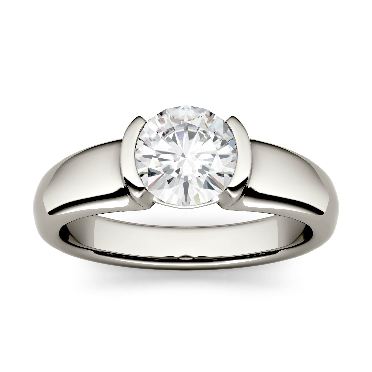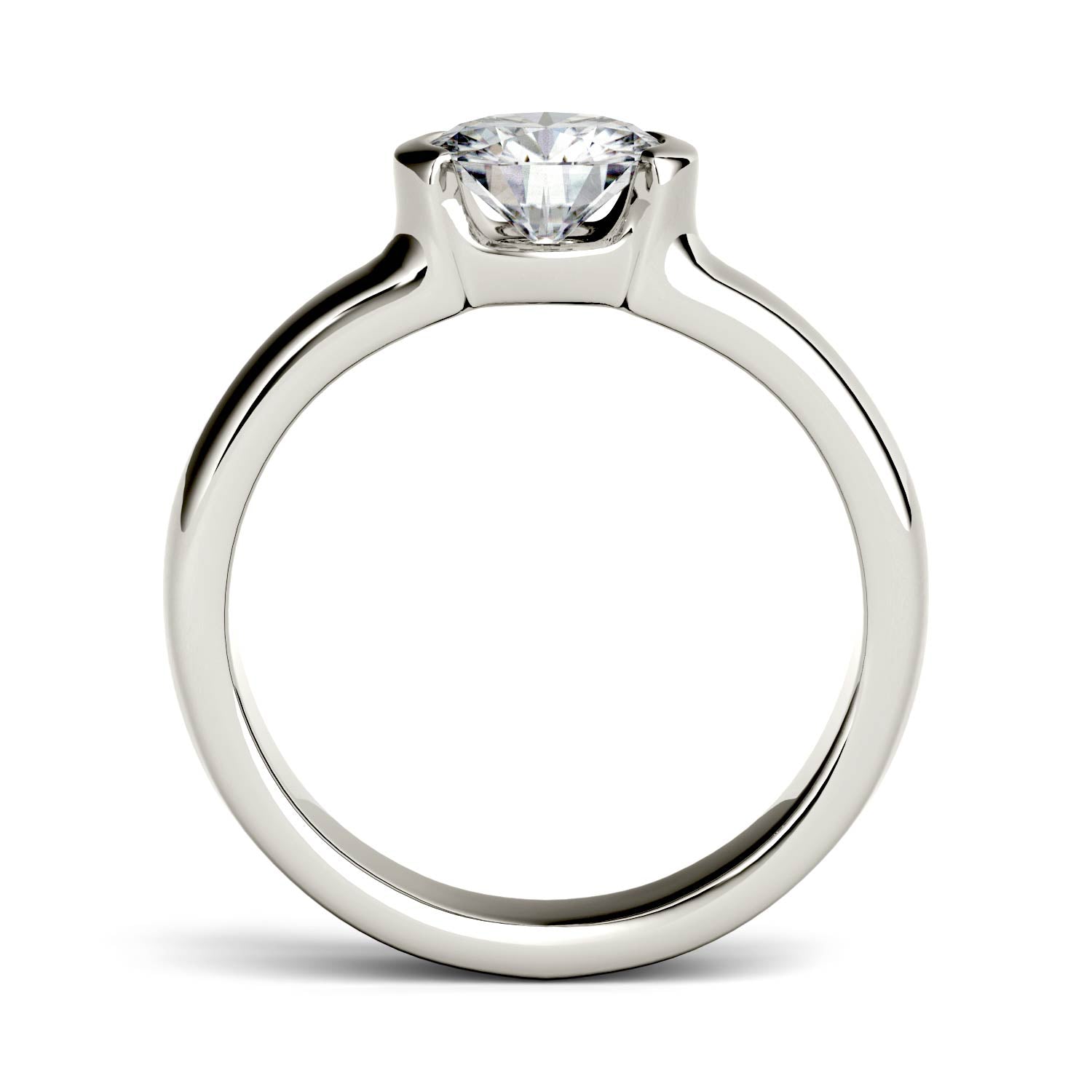 The unique half bezel setting makes for a one of a kind ring that beautifully showcases the round cut center stone. Shine bright and make a statement with this gorgeous piece.