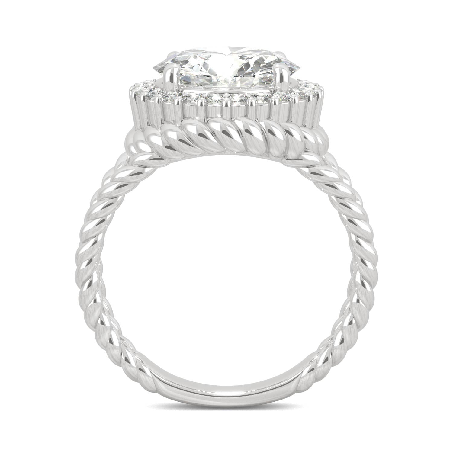 Featuring 25 shining moissanite gems, this alluring round halo engagement ring weighs in at 2.94 diamond equivalent carats and is set in a 14k white gold four-prong setting.