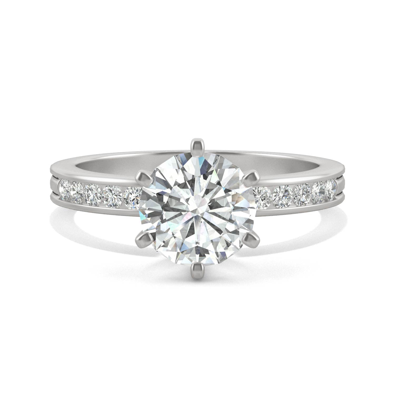 An amazing moissanite wedding ring that she is sure to treasure. This stunning 14K white gold ring features a 7.5mm round moissanite in a six prong setting. Accenting the center stones are 1.7mm round moissanite gemstones.