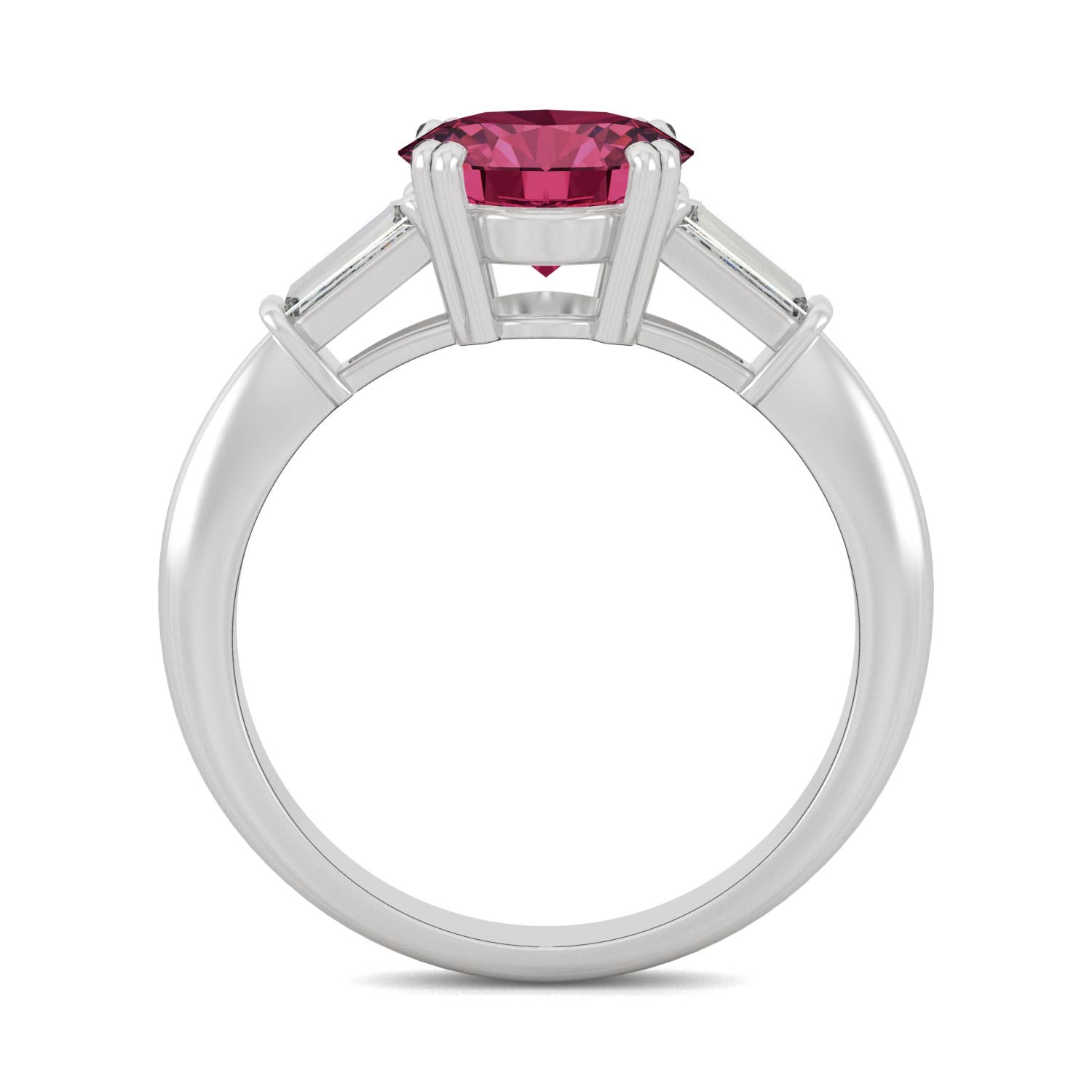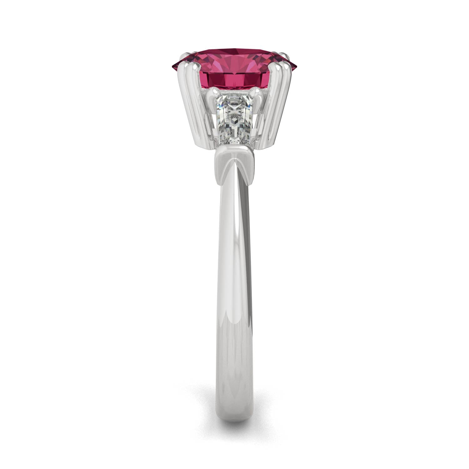 Set in double prongs, a round brilliant ruby sparkles atop this gorgeous ring, as tapered moissanite baguettes rest at each side. Blending antique charm and so-now style, it makes for a stunning proposal, or a glamorous gift.