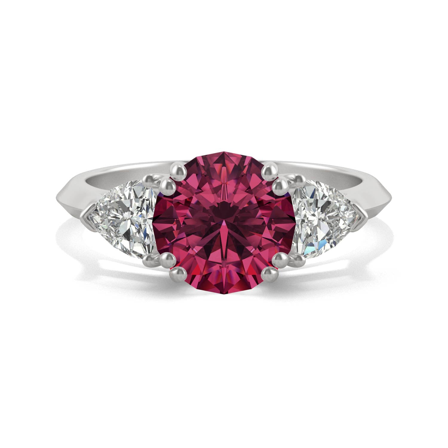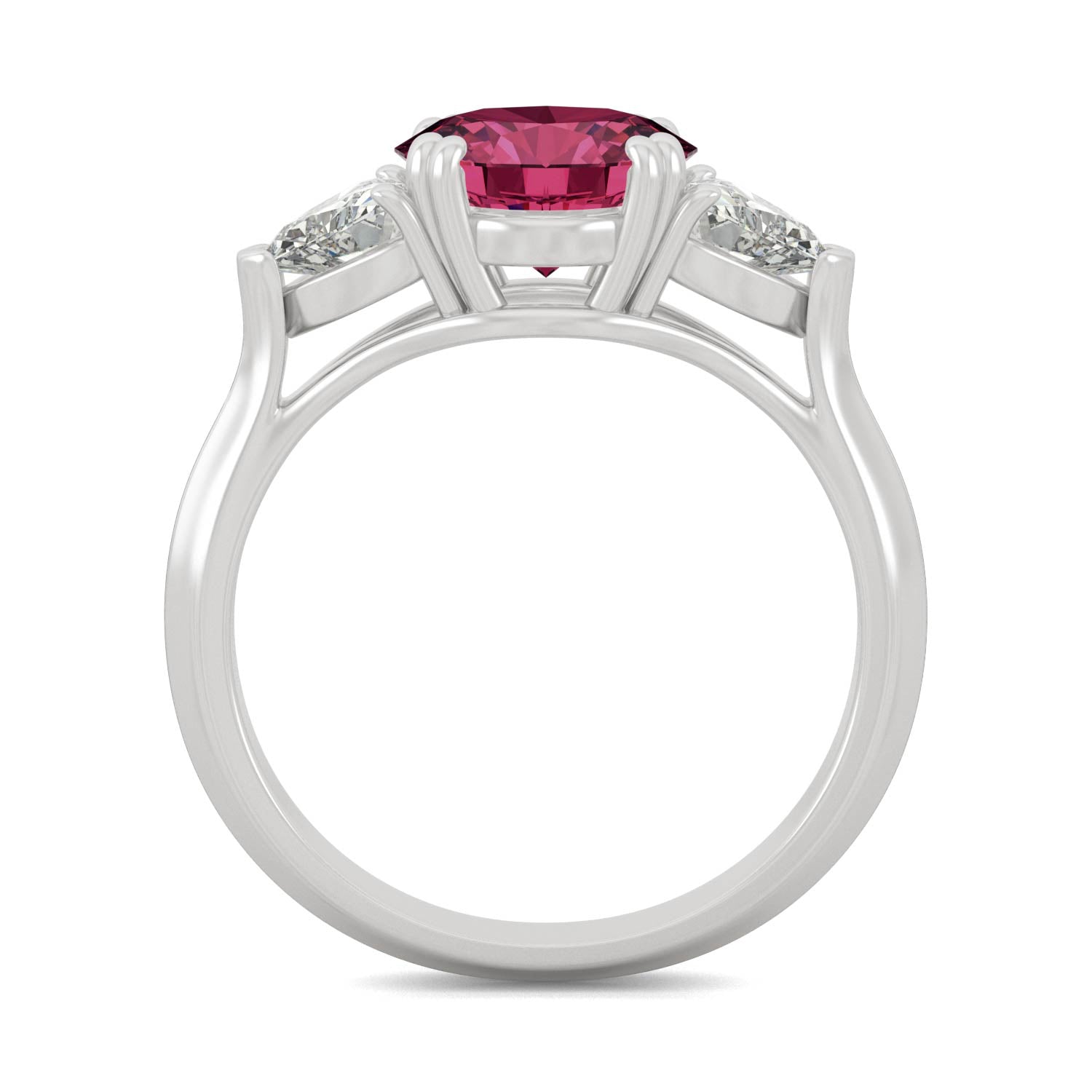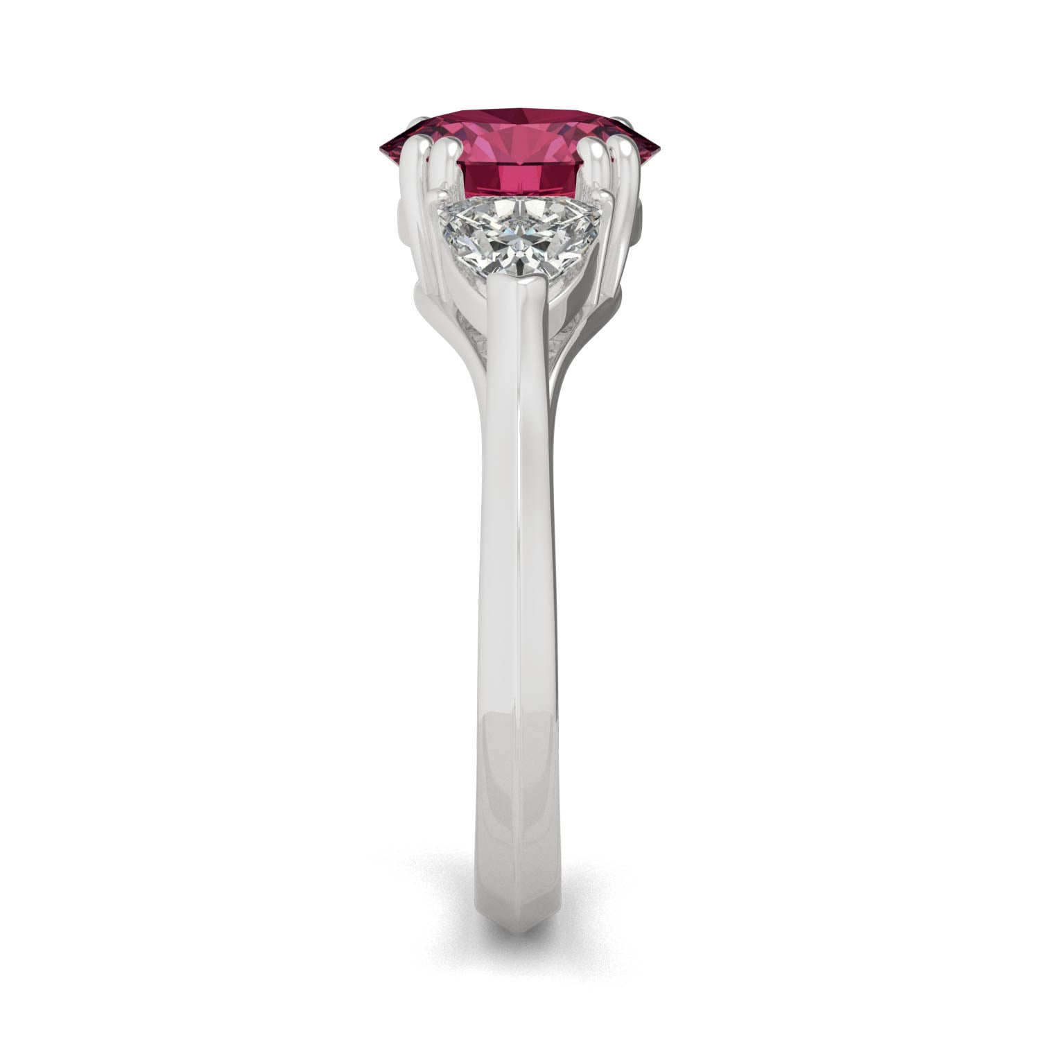 Behold the bold beauty of a brilliant round ruby beaming at the center of this ring. Flanked by trillion cut side stones that amplify the chic shine. Equally stunning as an engagement ring or a right hand ring.