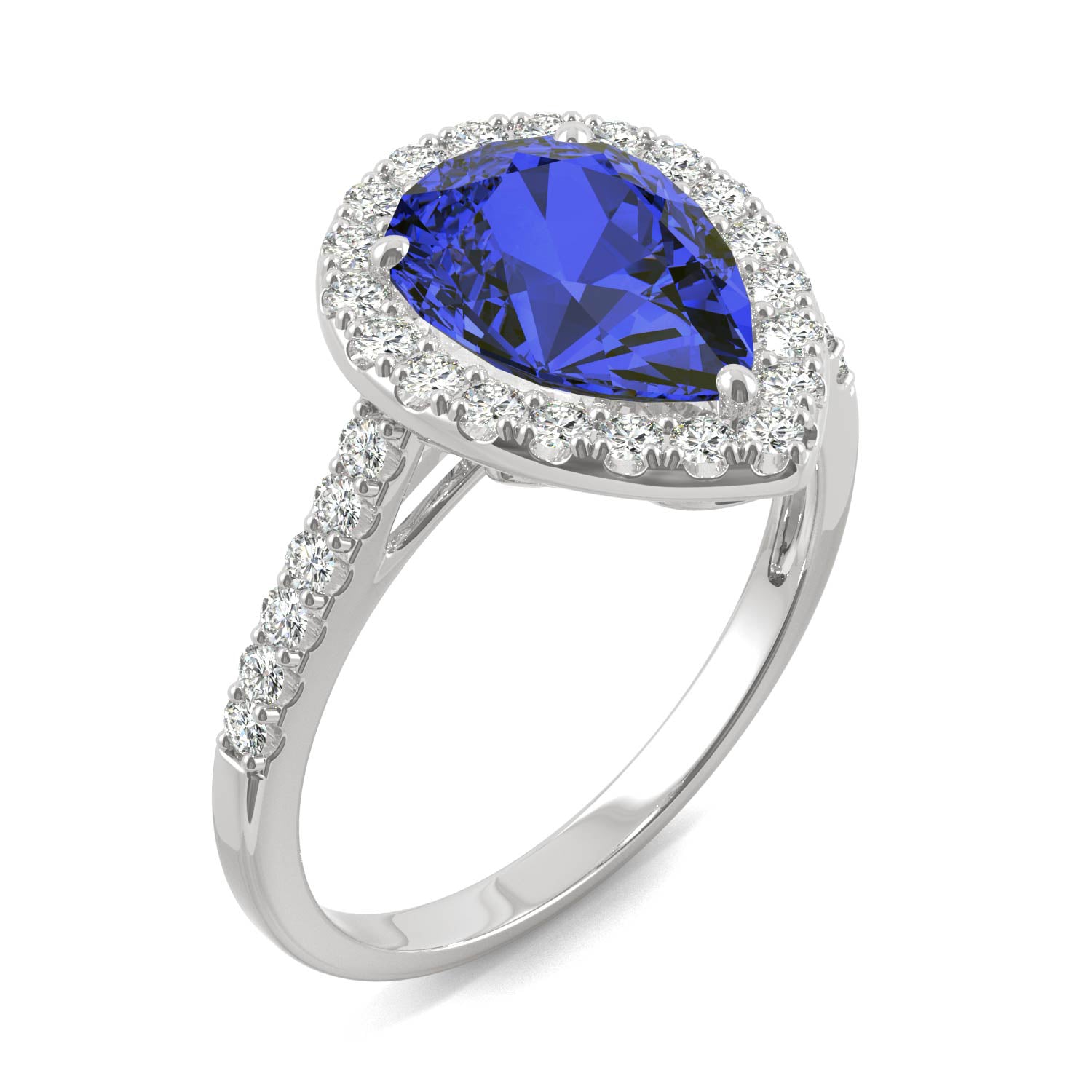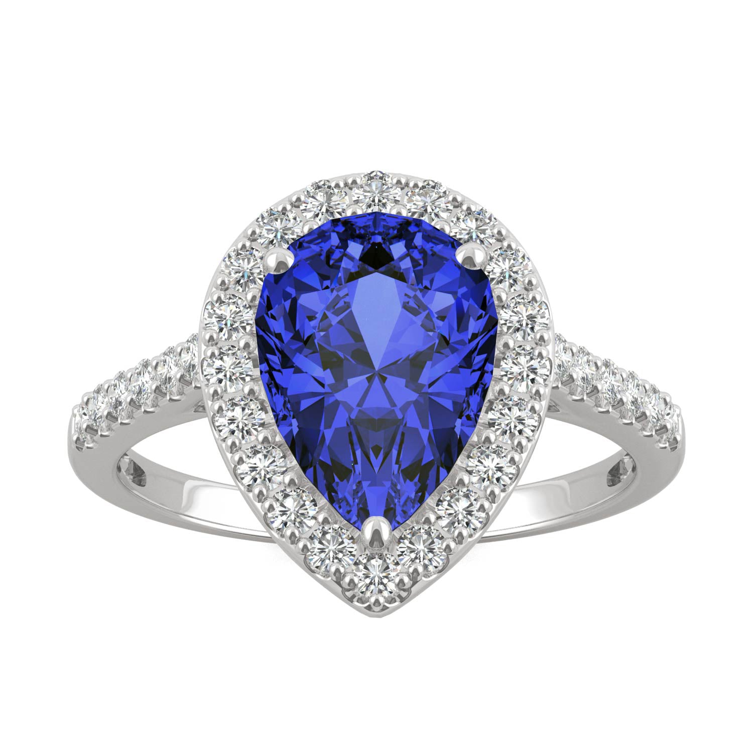 A pear shaped blue sapphire and shimmery halo exude classic elegance with heirloom appeal, creating one glamorous ring. Accent gems line the sides of a delicate band for additional glimmer. Perfect for an engagement, or as a right-hand ring.