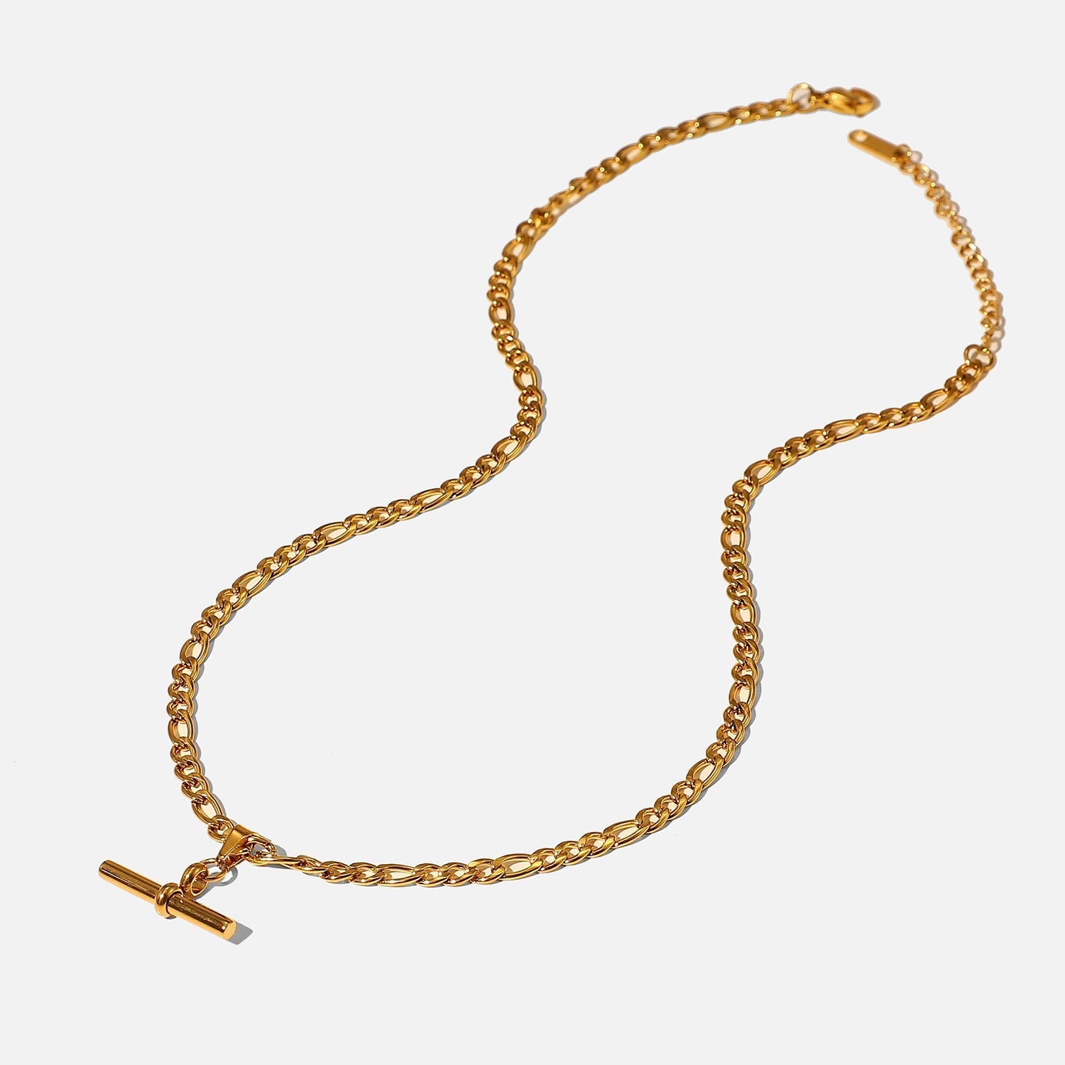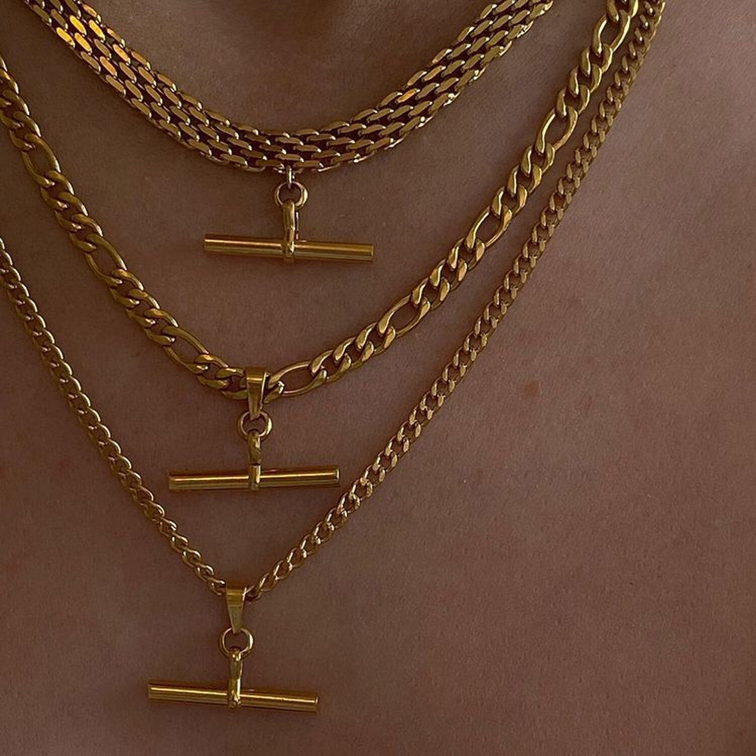 The T Bar Necklace features a minimalist 18k gold-filled design with a sleek T bar pendant. Its modern and simple aesthetic makes it a versatile piece, perfect for everyday elegance or layering with other necklaces.