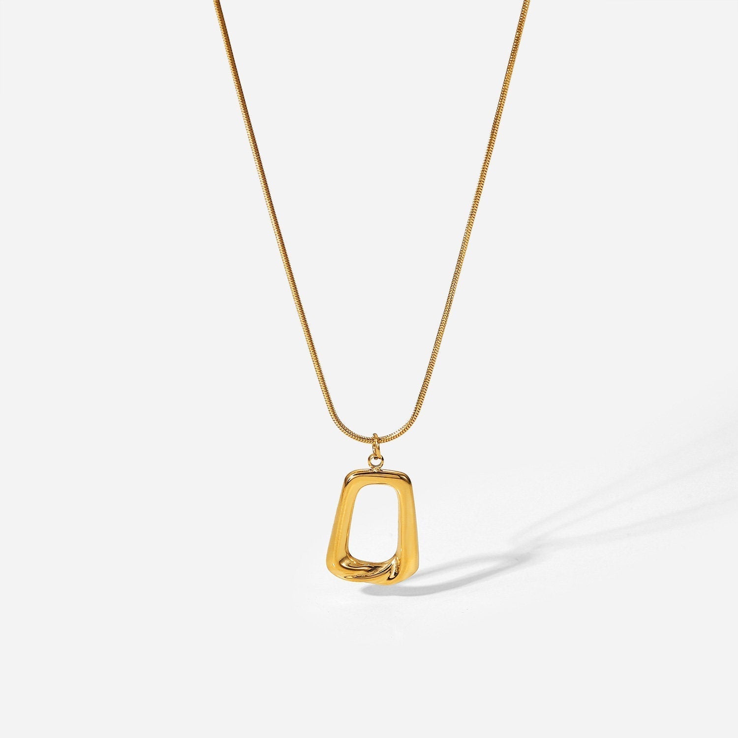 The Trapezoid Necklace features a unique 18k gold-filled trapezoid pendant, blending geometric shapes with modern style. This sophisticated piece adds a contemporary edge to any outfit, perfect for the fashion-forward individual.